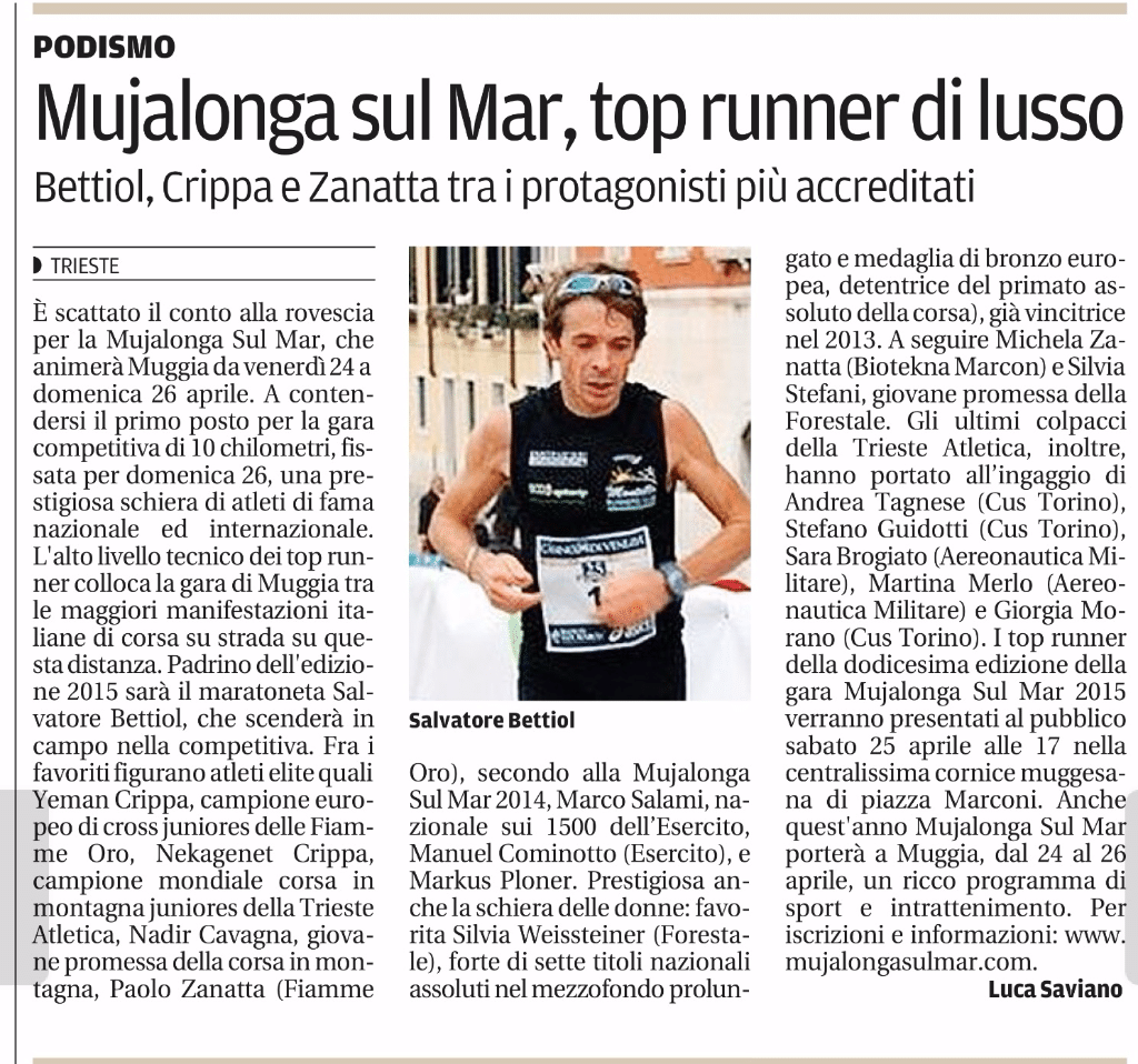 Ecco la prestigiosa schiera dei top runner della Mujalonga 2015. Vi aspettiamo venerdì 17 aprile alle 11 al Circolo Ufficiali di Trieste per tutti i dettagli sulla manifestazione e….ci saranno anche gli amici a quattro zampe della Scuola Cani Salvataggio FVG!